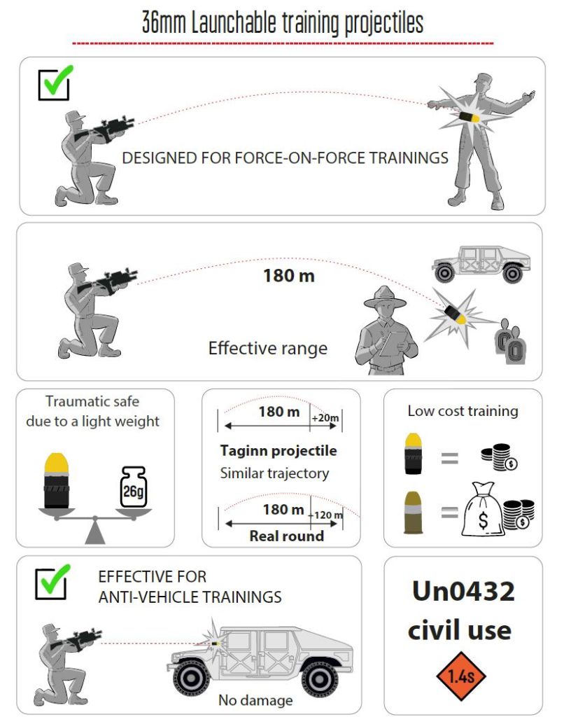 The Reaper Sub-caliber 5s enables realistic force-on-force and 360° target training with a real 40mm grenade launcher. With a 5-second delay, it’s ideal for targets up to 170 meters. This pyrotechnic round is crafted from trauma-safe, lightweight polyurethane foam and achieves high accuracy through its spinning motion, maintaining stability in flight until detonation (5 seconds after launch). The Reaper 5s adds precision and safety to advanced training scenarios.